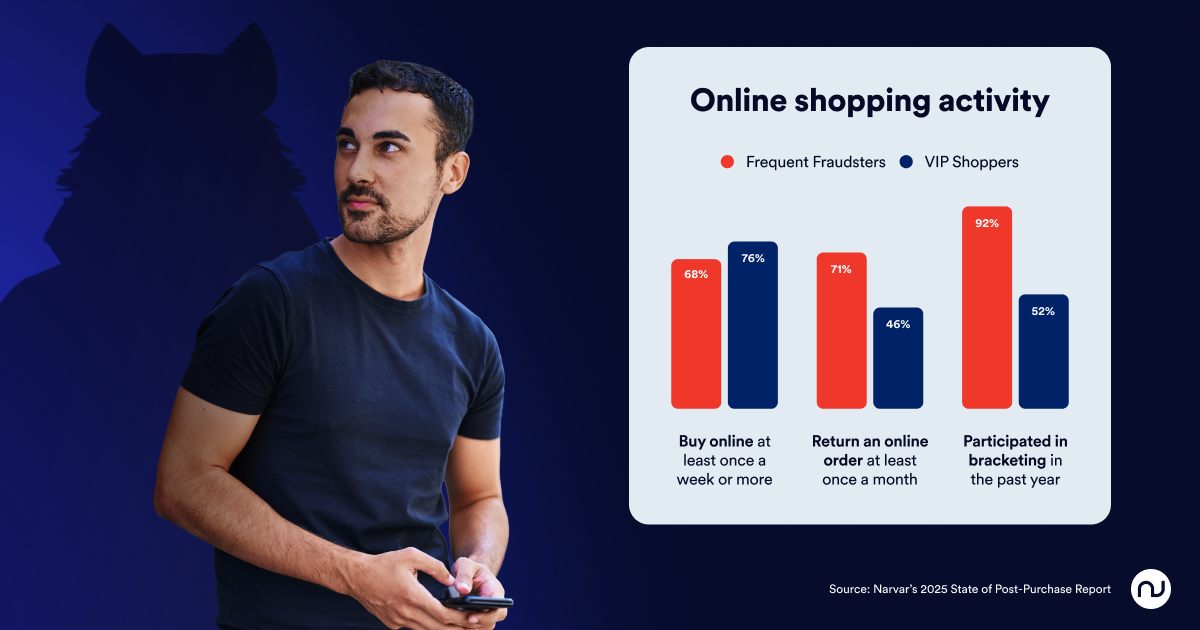 Fraudsters aren’t casual opportunists. They’re highly fluent ecommerce shoppers. On the surface, they behave just like your most valuable customers, sometimes even more so. For example, 68% buy online at least once a week, and 71% return an online order monthly. Nearly all of them (92%) engaged in bracketing this year. Those numbers often exceed the post-purchase habits of legitimate high-spend shoppers.