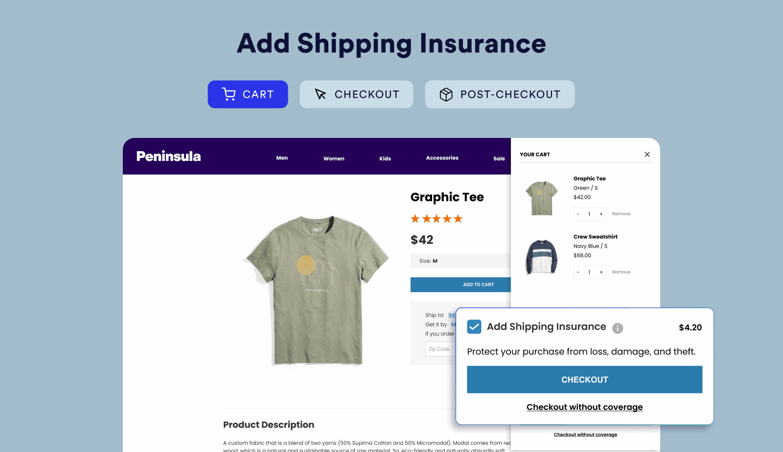 If an issue arises, such as a stolen package, lost shipment, or damaged delivery, shoppers can seamlessly file and manage claims through a branded self-service claims portal. This reduces support inquiries, protects retailer margins, and creates a smoother ecommerce checkout experience that can drive higher conversion rates.